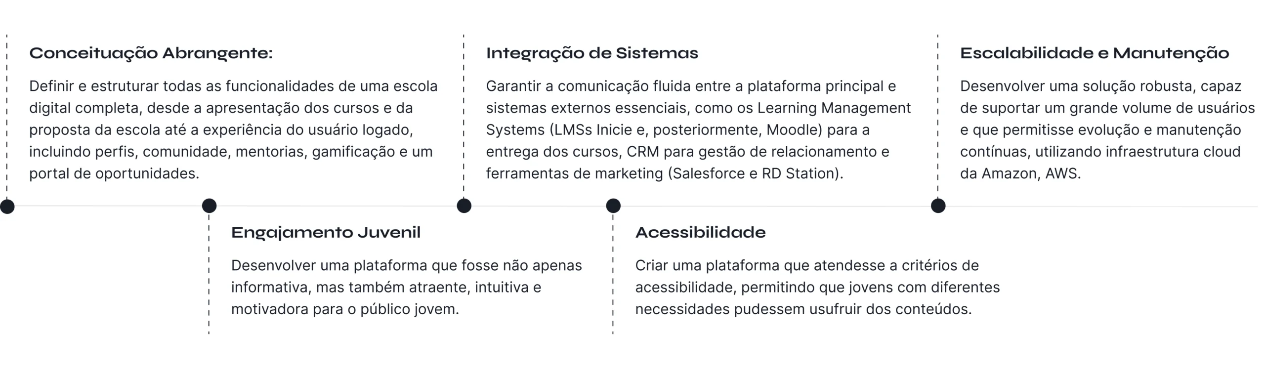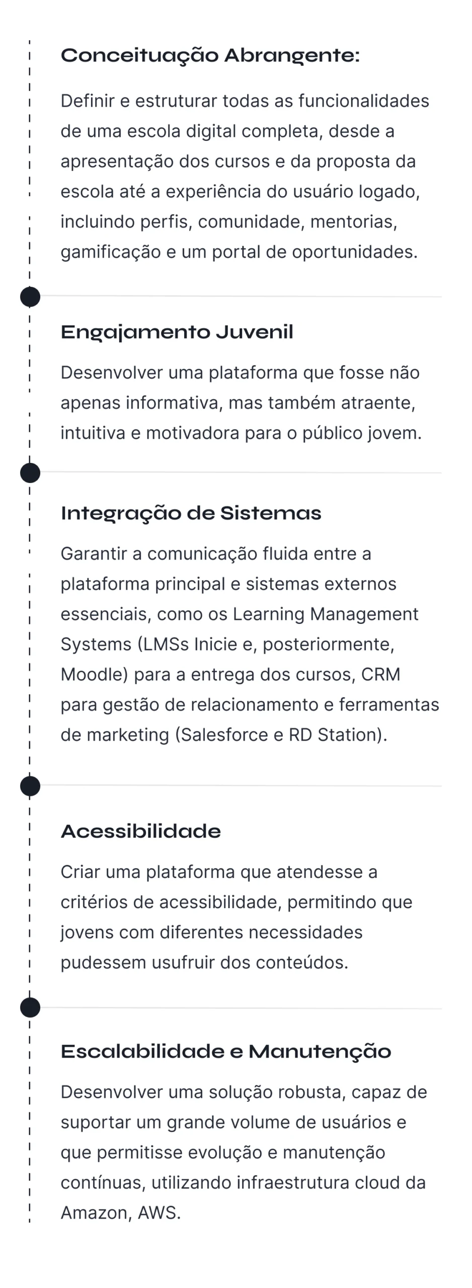 Para transformar essa visão em realidade, a Working Minds foi escolhida como o parceiro para atuação na conceituação, design de interação e implementação da plataforma digital da escola. Desde 2021, a Working Minds tem colaborado na criação de uma experiência de usuário engajadora e funcional, integrando a plataforma com sistemas de LMS (Inicie e Moodle), CRM e automação de marketing (Salesforce e RD Station).