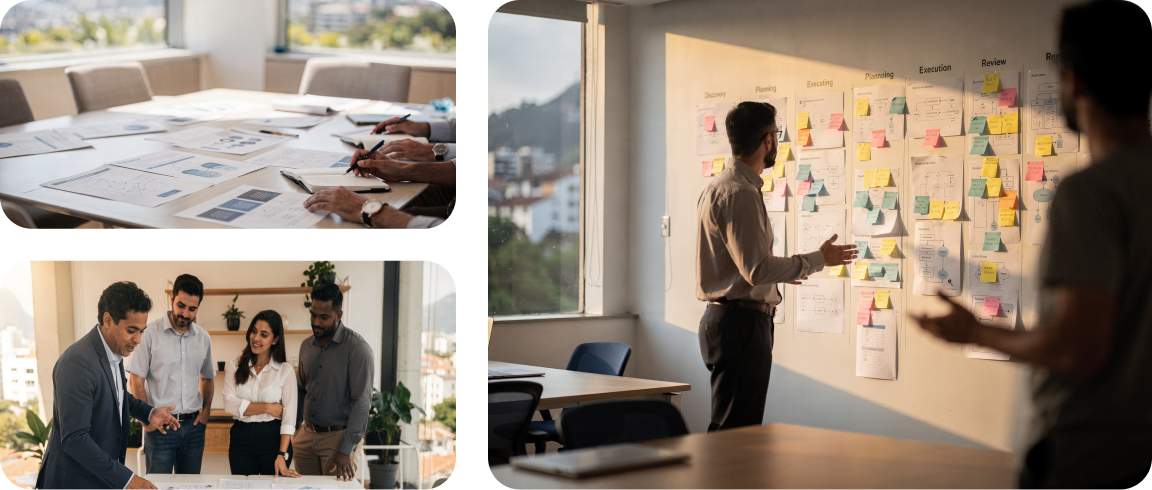 Nosso trabalho começa entendendo profundamente o negócio, o mercado e os usuários. A partir disso, definimos objetivos claros, escopo bem estruturado e critérios de decisão que orientam o desenvolvimento do produto com eficiência, previsibilidade e consistência.