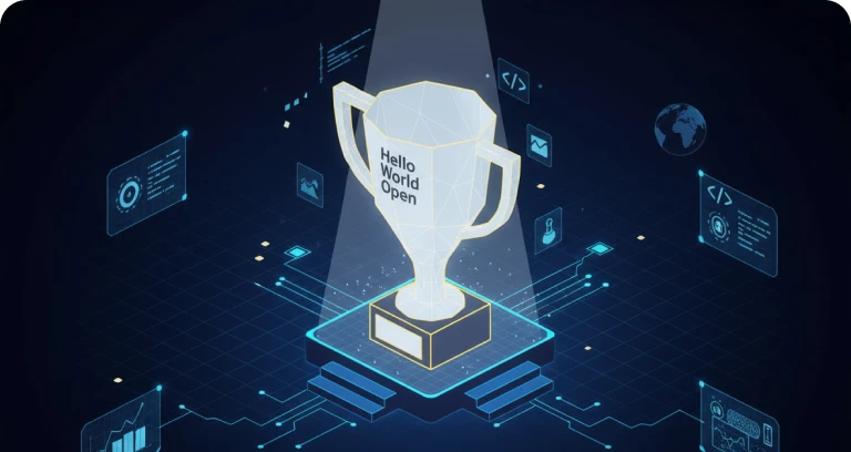 Participamos da competição global Hello World Open, conquistando o 2º lugar nas Américas e o 7º lugar mundial. A Previ se torna nossa cliente — parceria que permanece até hoje.